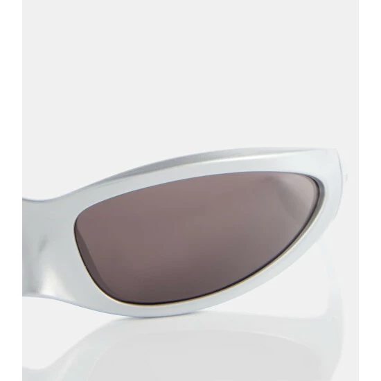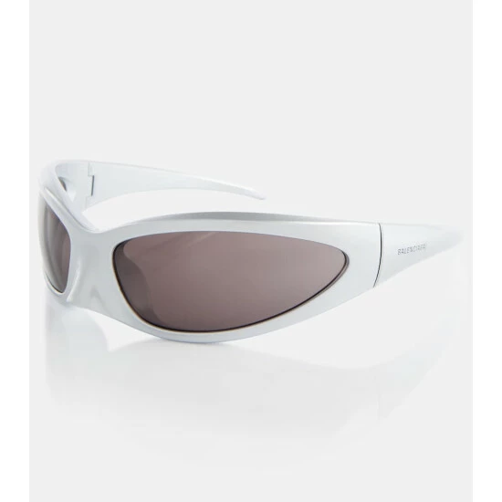 Balenciaga demonstrates their affinity for sculptural design with these angular acetate sunglasses. The silver wrap-around mask silhouette features a deep nose bridge for a unique statement look.