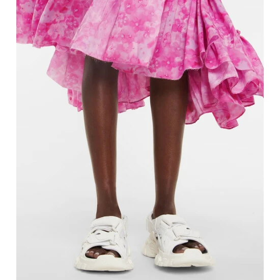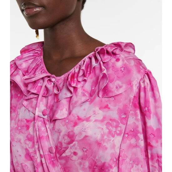 Balenciaga reinterprets its typically oversized, dramatic silhouettes with a soft color palette to present this pink midi dress. This wrap style fastens with tonal ties at the waist, and is framed with frothy ruffles at the neck and high-low hem. Note the raw edges, which provide the brand’s signature subversive finish.