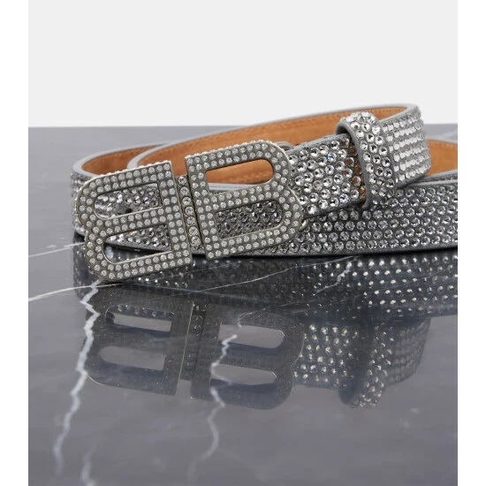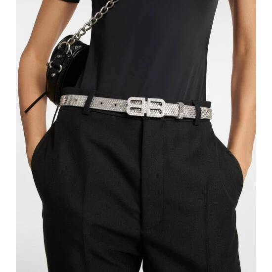 The Hourglass belt from Balenciaga is made in Italy from crystal-embellished suede in a thin design. It features matching belt loops and an embellished BB logo buckle.