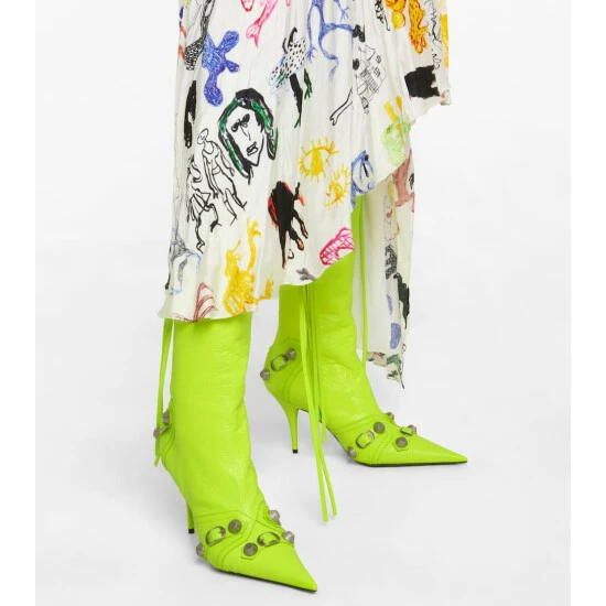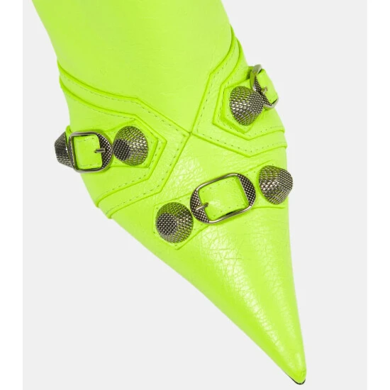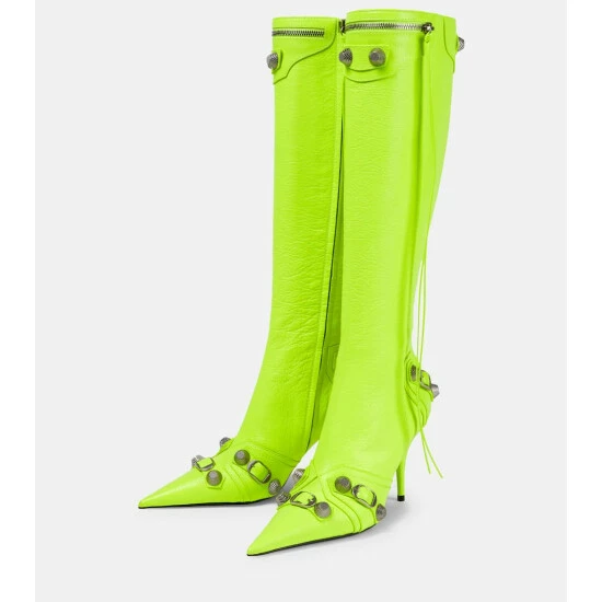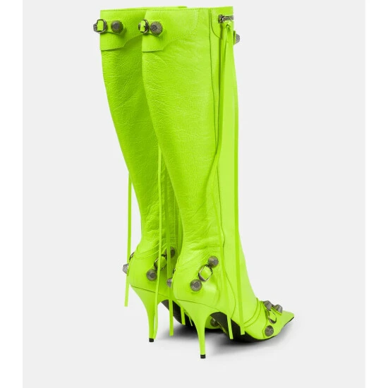 The Cagole knee-high boots feature the same grooved rivets as Balenciaga’s iconic bag of the same name. They’re made from grained leather and feature decorative buckles and 90mm stiletto heels.