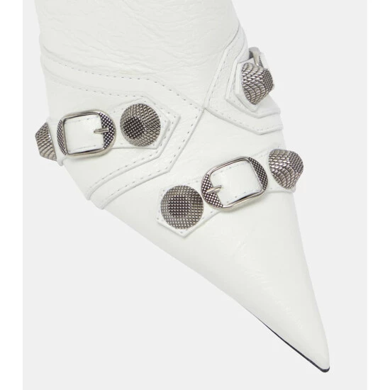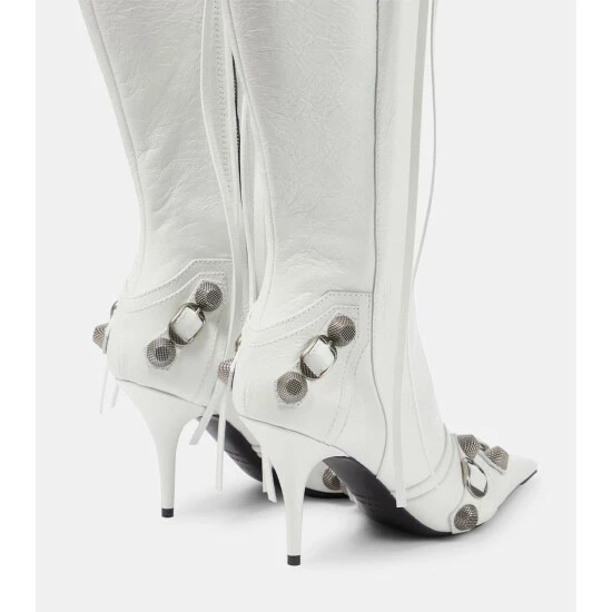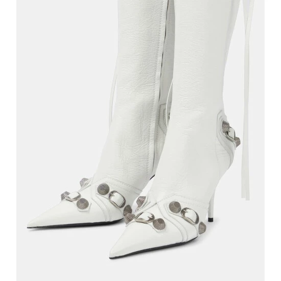 The Cagole boots feature the same grooved rivets and leather fringing as Balenciaga’s iconic bag of the same name. This knee-high pair is set on 90mm heels and comes in white calf leather with a trio of decorative buckles on the pointed toes.