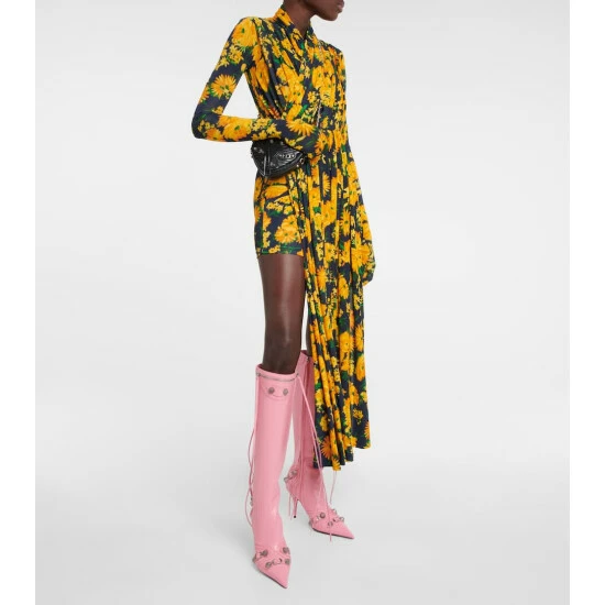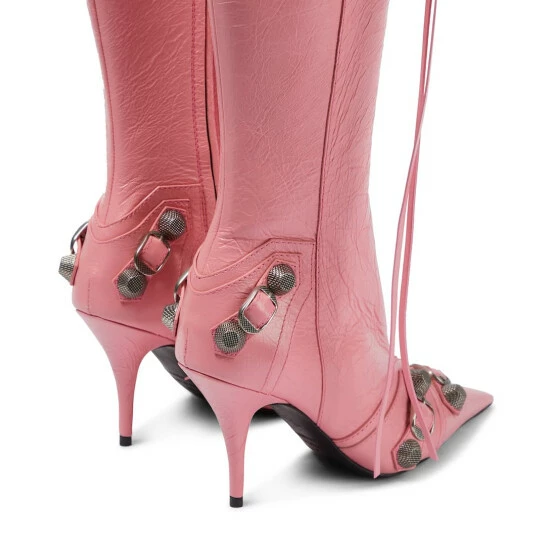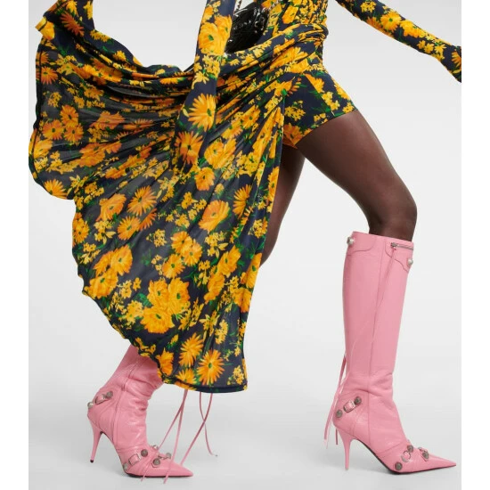 The Cagole knee-high boots feature the same grooved rivets as Balenciaga’s iconic bag of the same name. They’re made from grained leather and feature decorative buckles and 90mm stiletto heels.