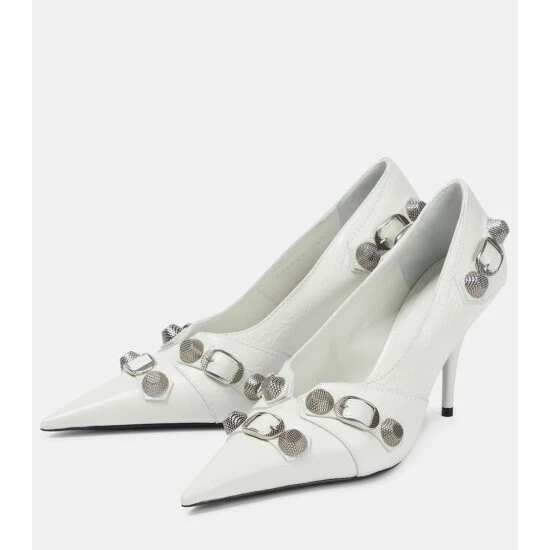 The Cagole pumps feature the same grooved rivets as Balenciaga’s iconic bag of the same name. These calf leather stilettos are embellished with decorative buckles on the pointed toes and heel counter.