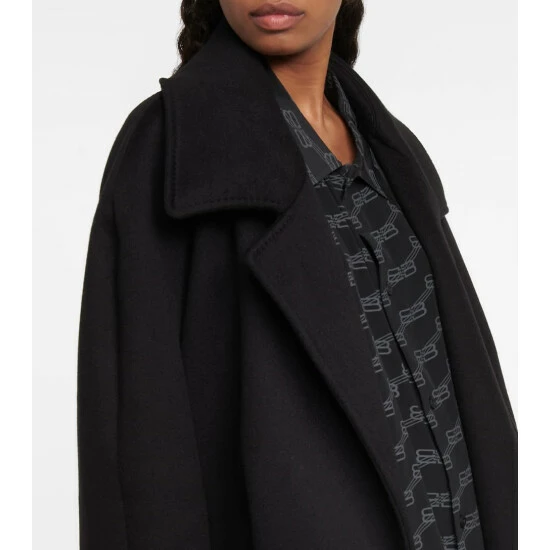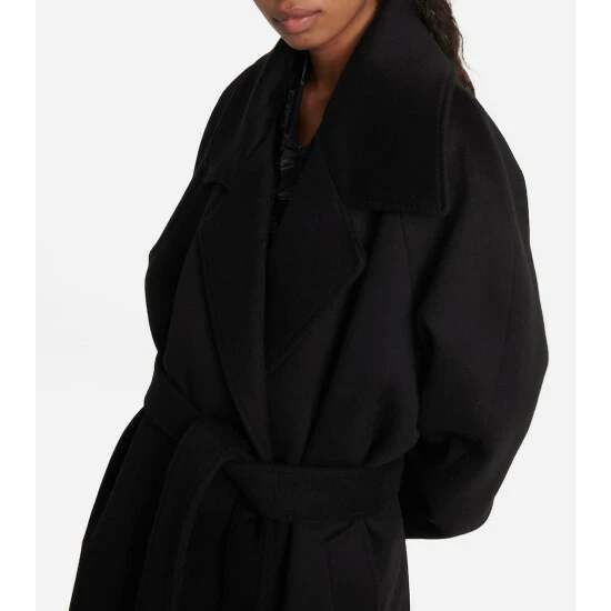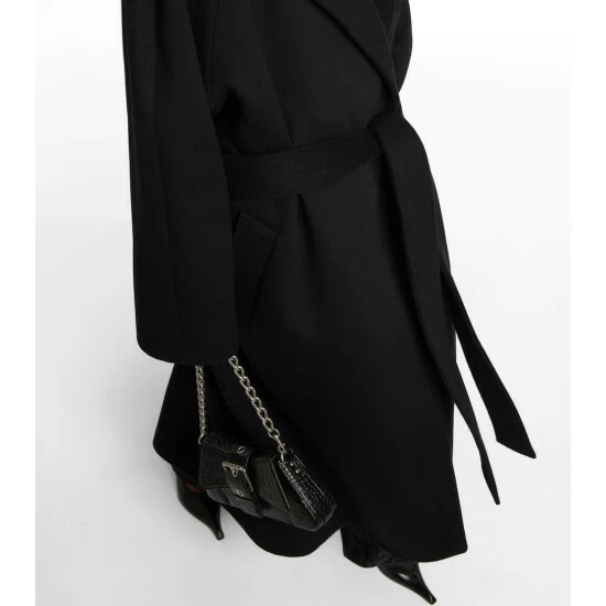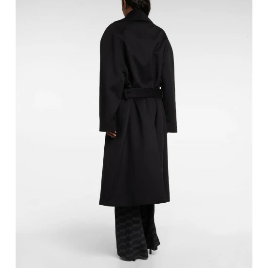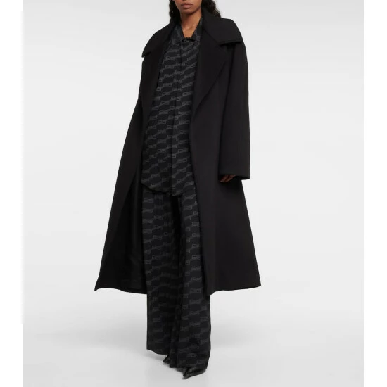 Balenciaga showcases its sharp tailoring in this belted coat from the Spring ’23 collection. Made from a cashmere and wool blend, the timeless style has raglan sleeves, a large notch lapel, and an oversized fit.