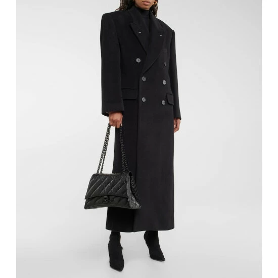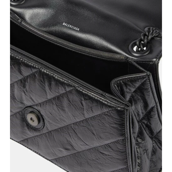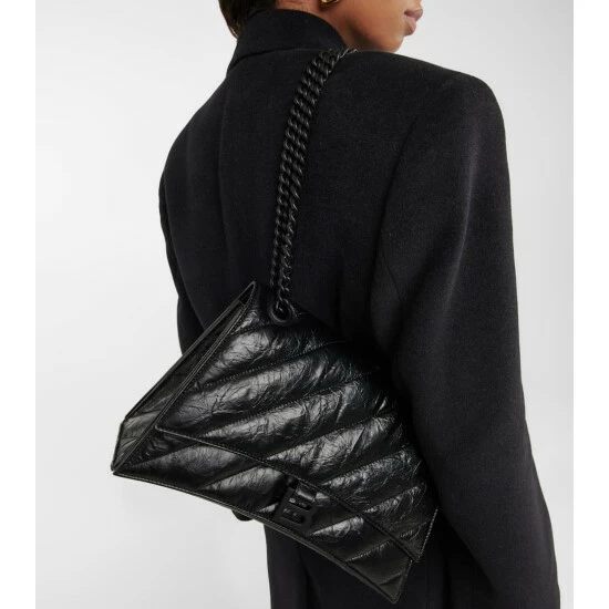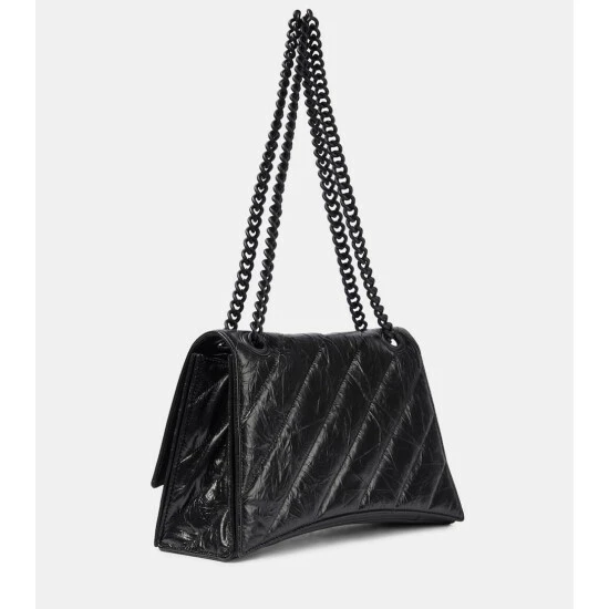 Balenciaga updates its Crush shoulder bag with an all-black design and mid-size silhouette. In the signature curved silhouette, the quilted design is made from crushed leather and has a tonal chain strap and logo hardware.