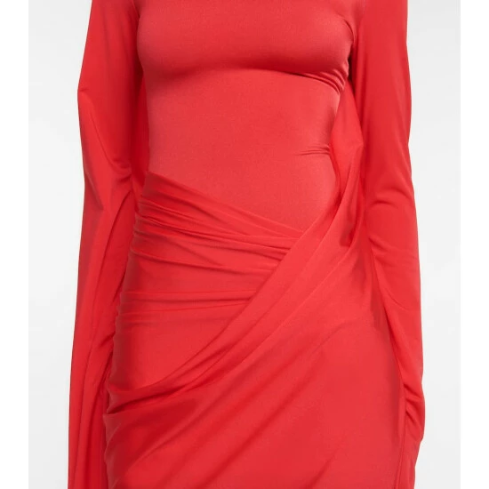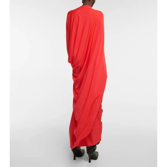 Balenciaga’s gown is a sculptural silhouette in fluid matte jersey. It has a high neck, draped details and cape-like shape.
