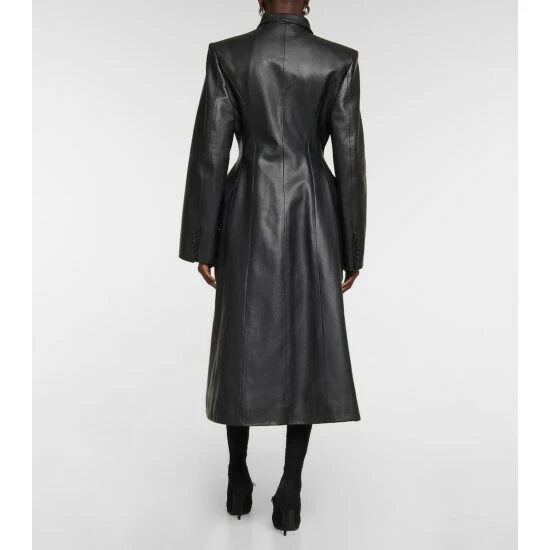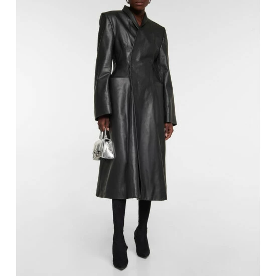 A sculptural style from Balenciaga’s Fall ’22 runway, this midi coat is made entirely from smooth, shiny bull skin leather. It has a high collar, an hourglass fit, and an asymmetric front.