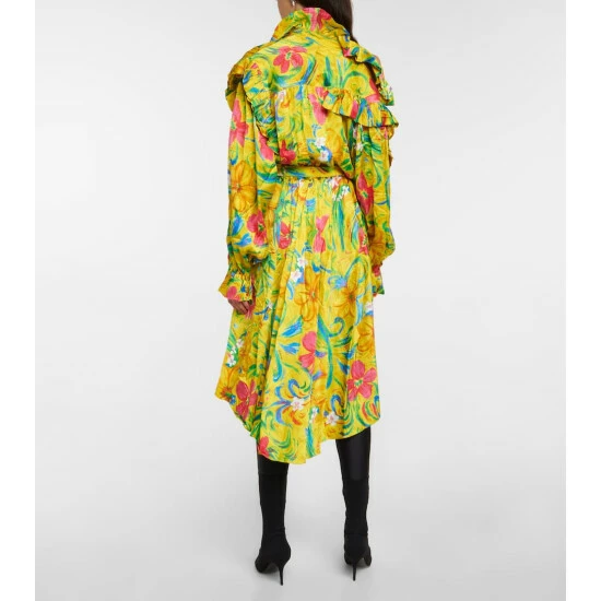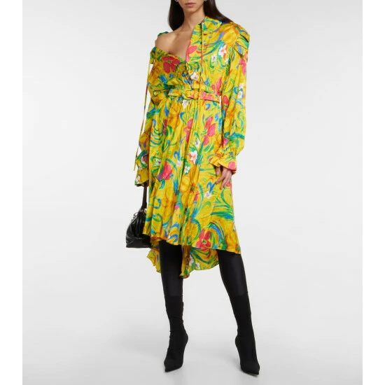 Embrace vibrant prints with this colorful midi dress from Balenciaga. It features a joyful floral jacquard motif and is finished with ruffled trims and a belted waist.