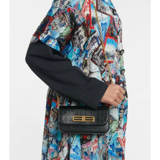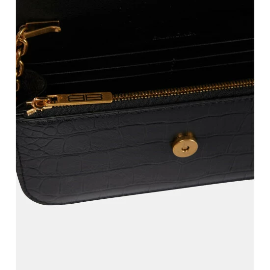 Balenciaga’s vintage-inspired Gossip wallet on chain arrives in timeless black croc-effect leather. The baguette style has a flap opening with BB hardware and an antiqued chain-link shoulder strap.
