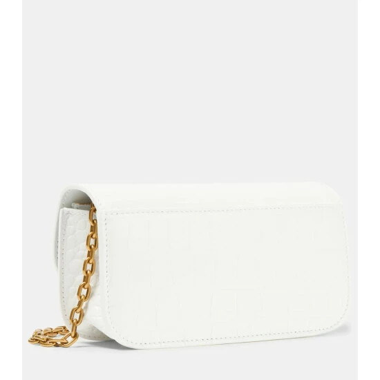 Balenciaga’s vintage-inspired Gossip wallet on chain arrives in timeless white croc-effect leather. The baguette style has a flap opening with BB hardware and an antiqued chain-link shoulder strap.