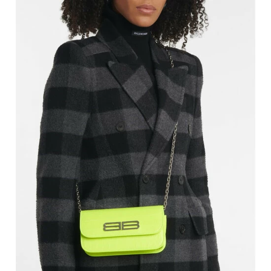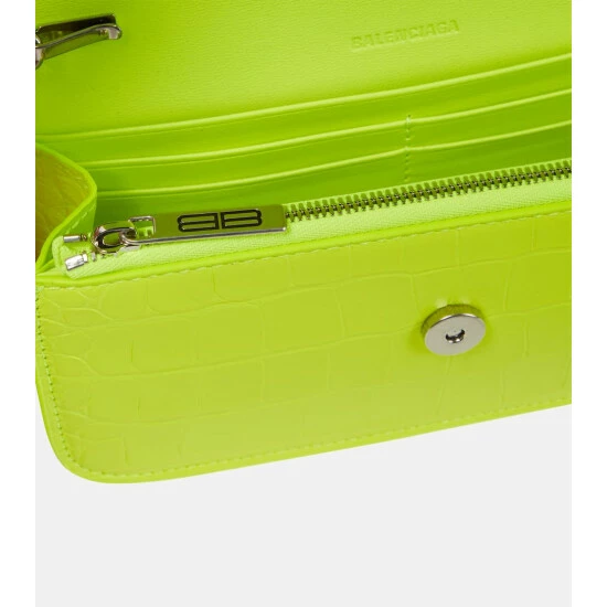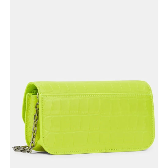 Balenciaga’s vintage-inspired Gossip wallet on chain is given a modern makeover in neon yellow croc-effect leather. The baguette style has a flap opening with BB hardware and an antiqued chain-link shoulder strap.