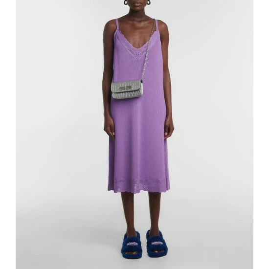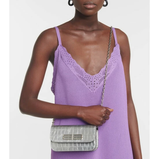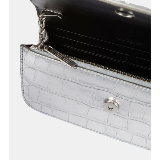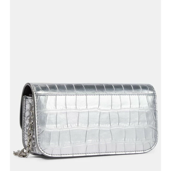 Balenciaga’s vintage-inspired Gossip wallet on chain is given a modern makeover in metallic croc-effect leather. The baguette style has a flap opening with BB hardware and an antiqued chain-link shoulder strap.