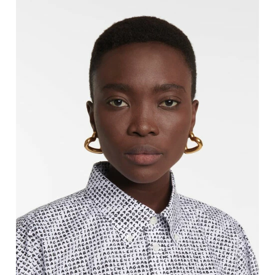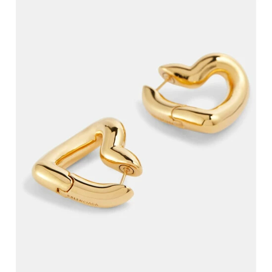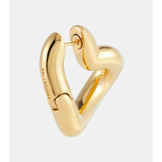 These hoop earrings from Balenciaga are shaped in the form of hearts. Made in Italy from golden metal, they’re embossed with the house’s logo lettering and secure with hinged posts for pierced ears.