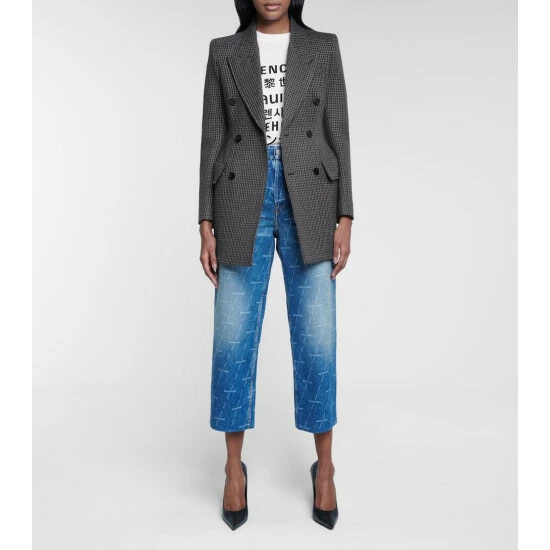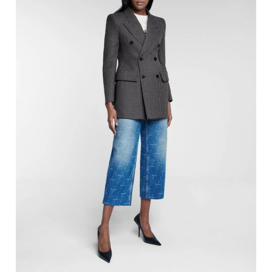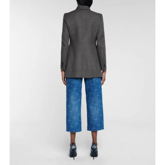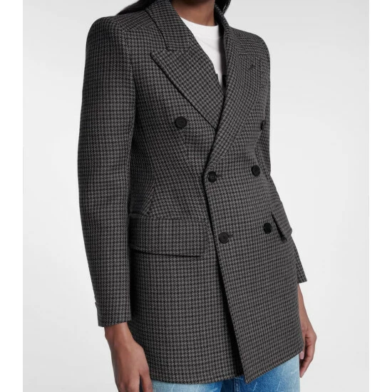 Balenciaga’s iconic Hourglass blazer has a silhouette cemented in fashion history. Made from Italian virgin-wool suiting fabric in classic gray houndstooth checks, this elegant design is defined by sharply padded shoulders, a cinched waist and exaggerated hips. Wear yours with pencil skirts and boyfriend denim alike.