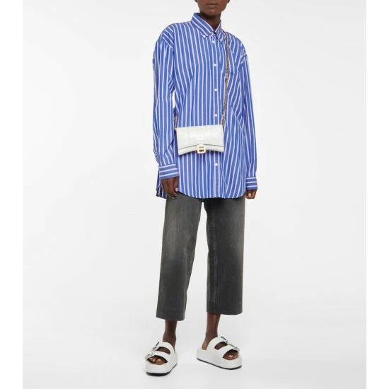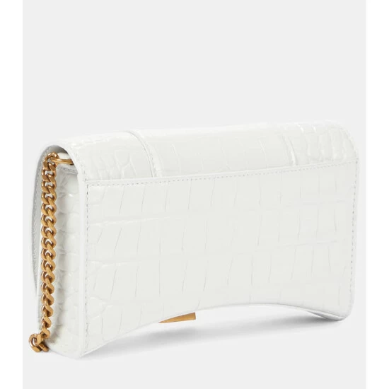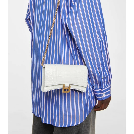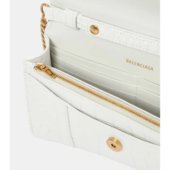 This wallet on chain is the latest member of Balenciaga’s Hourglass family. In white hyperreal mock-croc, it’s a serious fashion statement that’s practical, too – it has six card slots, another one for notes and a zipped compartment.