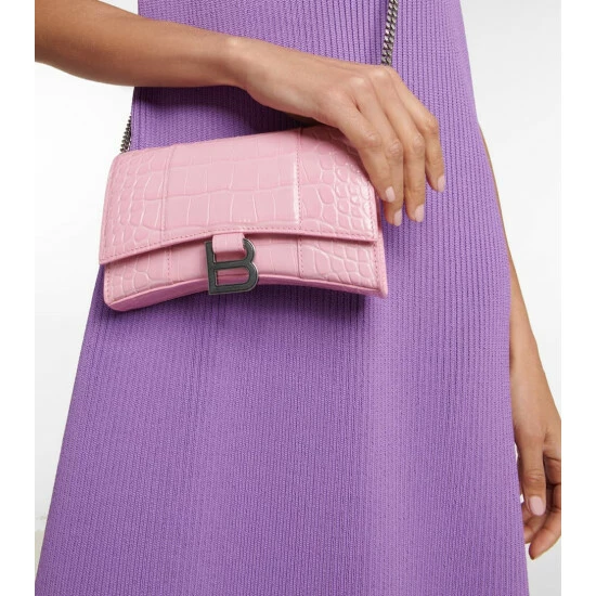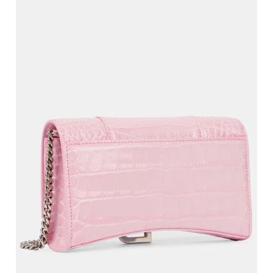 Balenciaga expands its Hourglass family with this wallet on chain. Made from pink croc-effect leather, it’s a serious fashion statement that’s practical, too; it has six card slots, a bill pocket, and a zipped compartment.