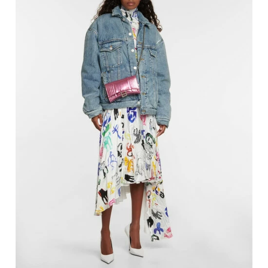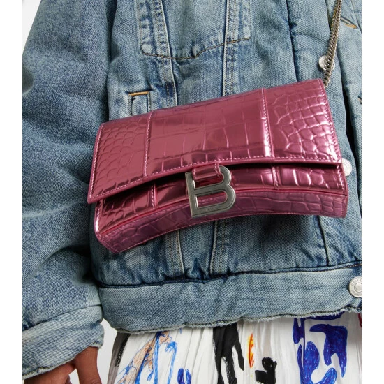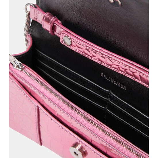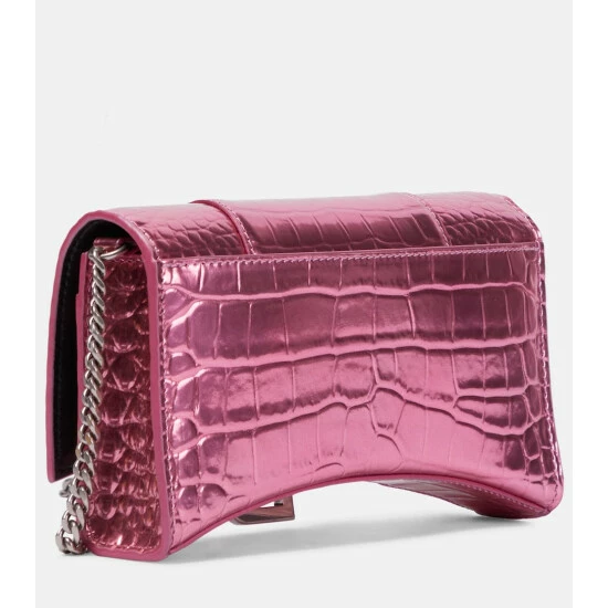 Dial up the glamour with the Hourglass wallet on chain from Balenciaga. It’s made from pink croc-effect metallic leather with a silver-tone curb-chain shoulder strap and a B-monogram clasp.