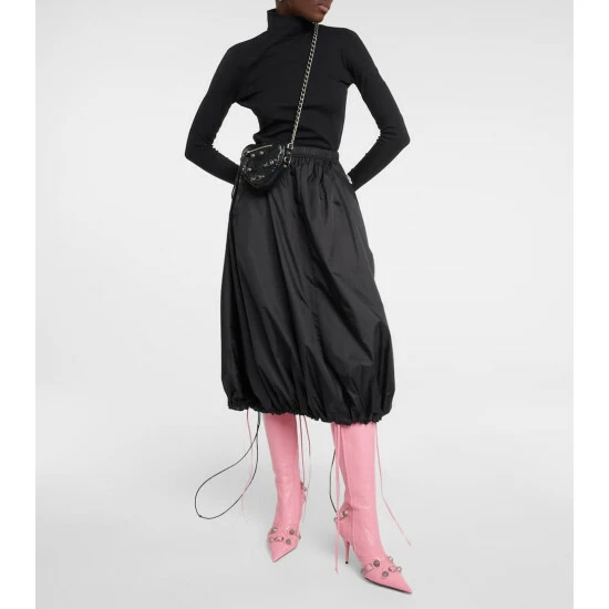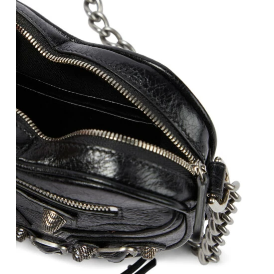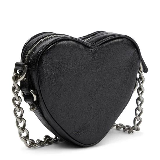 Balenciaga’s Le Cagole design is fashion’s new “it” bag. Made from crinkled black leather, it’s studded with textured hardware, and features an outer zip pouch and heart-shaped mirror charm.