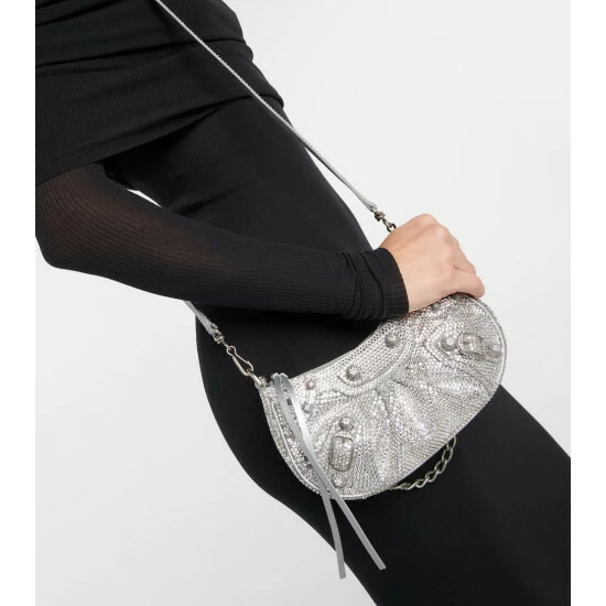 Balenciaga re-imagines a style from the ’00s with the embellished Le Cagole mini shoulder bag. Made from lamb leather in a hemispherical shape, it comes with an outer zip pouch and a heart-shaped mirror charm.