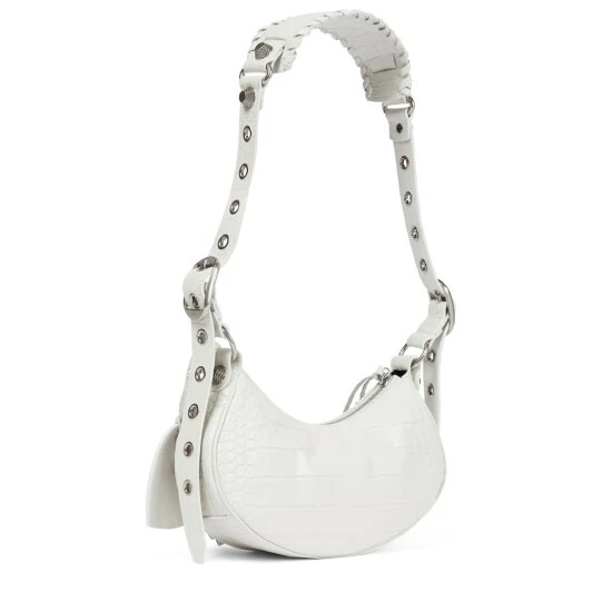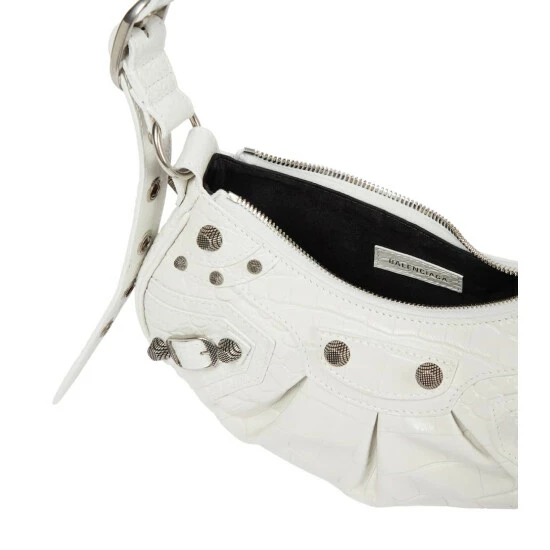 Though small in size, Balenciaga’s Le Cagole Mini shoulder bag is big in impact. Made from croc-effect white leather, it’s finished with textured, silver-toned hardware, an outer zip pouch and heart-shaped mirror charm.
