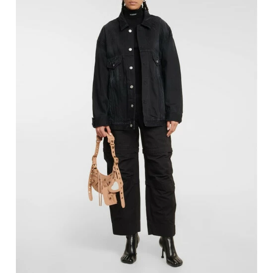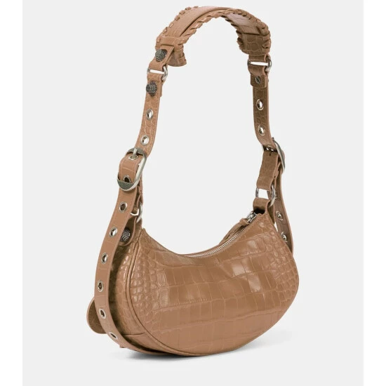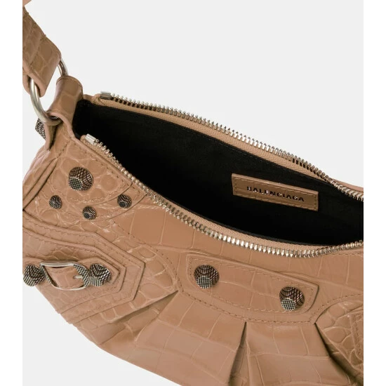 Balenciaga’s Le Cagole Mini design is fashion’s new “it” bag. Made from croc-effect leather in neutral beige, it’s studded with textured hardware, and features an outer zip pouch and heart-shaped mirror charm.