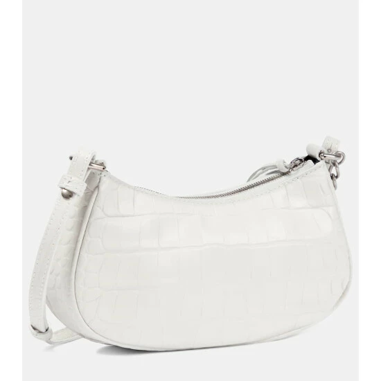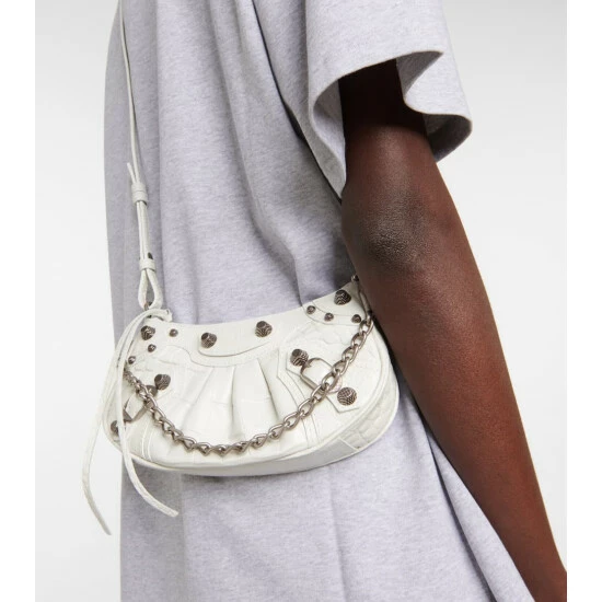 Balenciaga’s Le Cagole Mini design is fashion’s new “it” bag. Made from white leather with a croc-effect, it’s studded with textured hardware and features a chain strap, as well as a leather crossbody one.