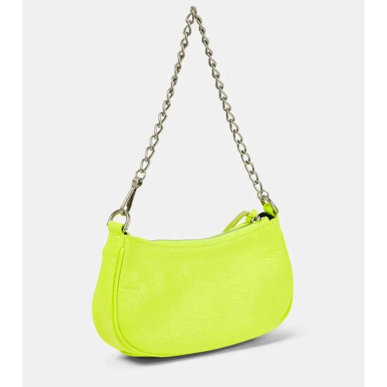 Balenciaga’s Le Cagole Mini design is fashion’s new “it” bag. Made from neon yellow leather with a crinkled effect, it’s studded with textured hardware and features a chain and a leather strap.