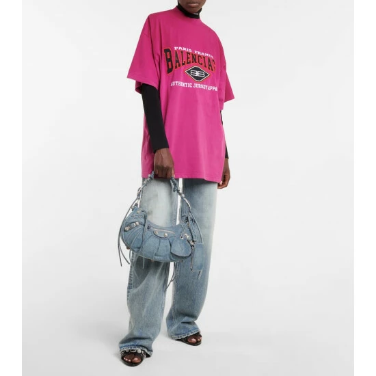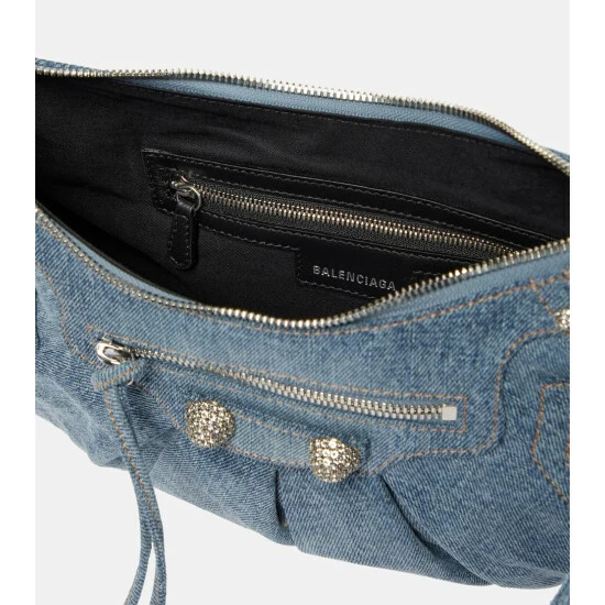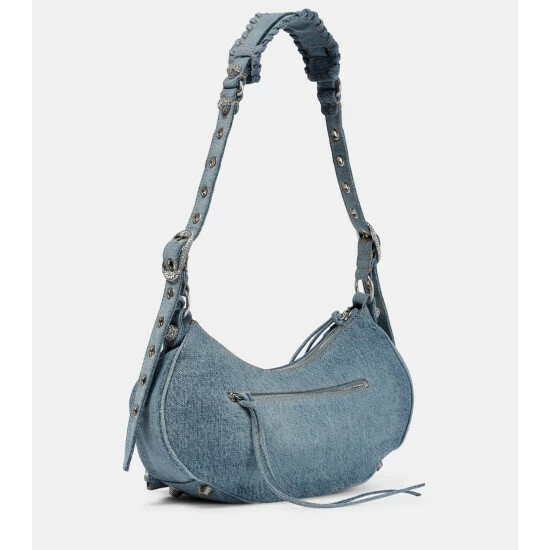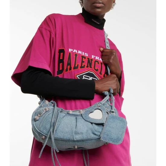 Balenciaga’s Le Cagole Small design is fashion’s new “it” bag. Made from denim, it’s studded with textured hardware, and features an outer zip pouch and heart-shaped mirror charm.