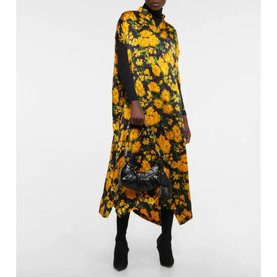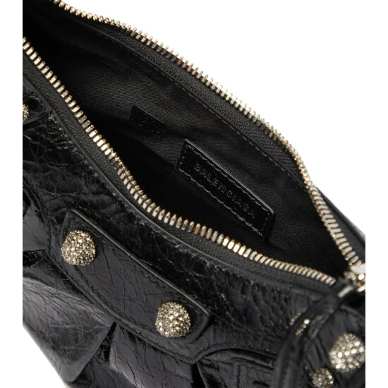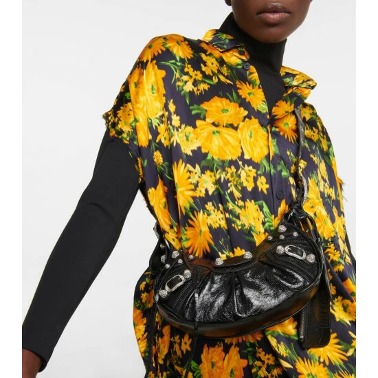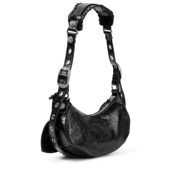 Balenciaga’s Le Cagole Small design is fashion’s new “it” bag. Made from crinkled black leather, it’s studded with textured hardware, and features an outer zip pouch and heart-shaped mirror charm.