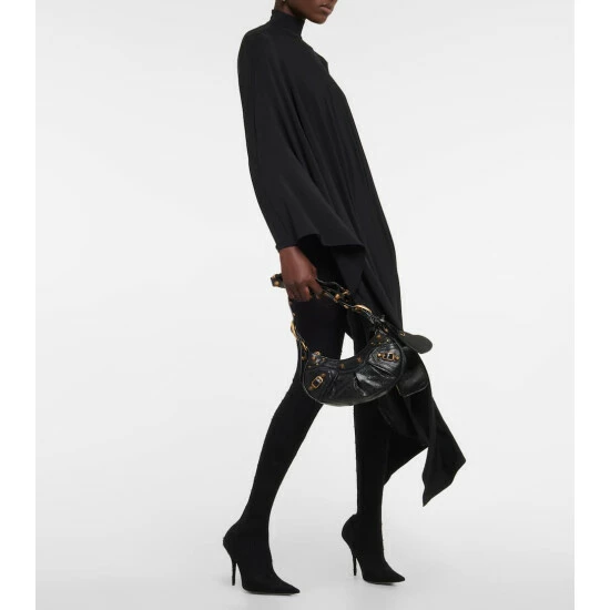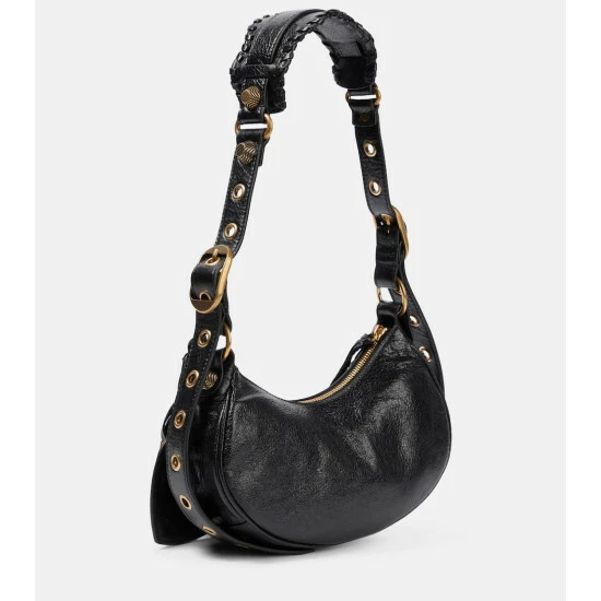 Balenciaga re-imagines a style from the ’00s with the Le Cagole XS shoulder bag. Made from crinkled black lamb leather in a hemispherical shape, it suspends an outer zip pouch and a heart-shaped mirror charm.
