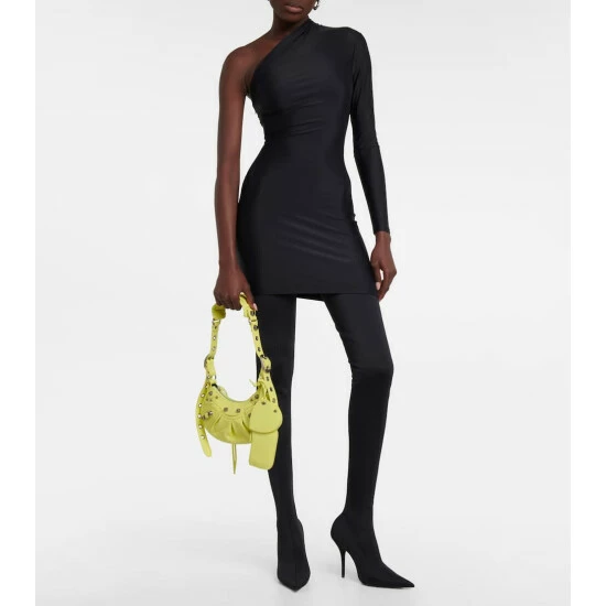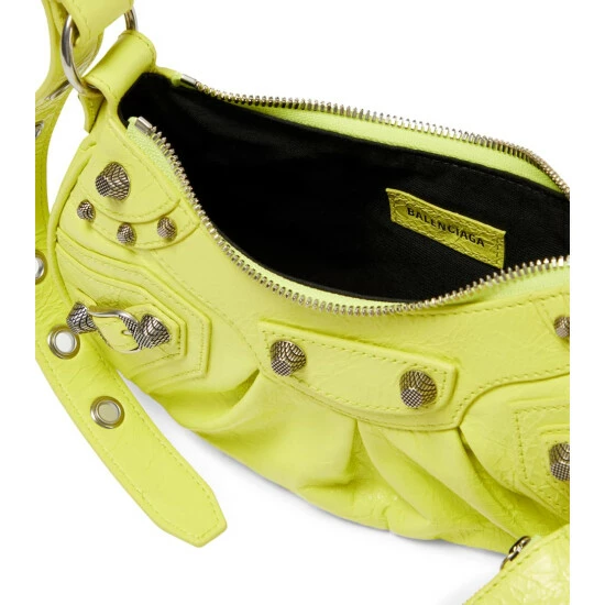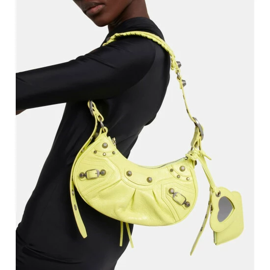 Balenciaga re-imagines a style from the ’00s with the Le Cagole XS shoulder bag. Made from lime-hued leather in a hemispherical shape, it suspends an outer zip pouch and a heart-shaped mirror charm.