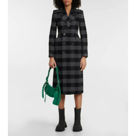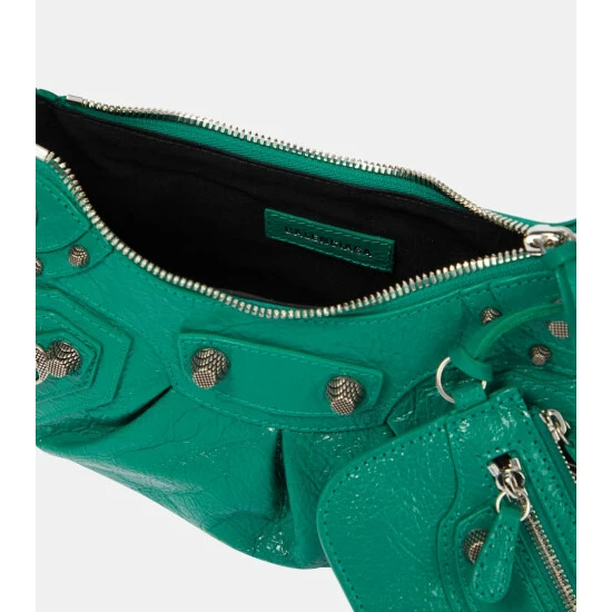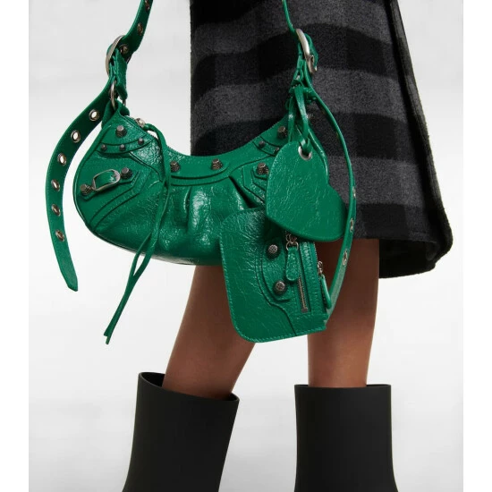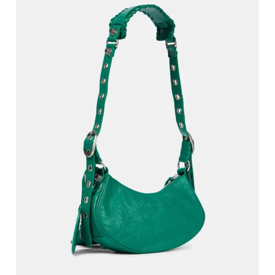 Balenciaga re-imagines renowned styles from the ’00s with its Le Cagole XS shoulder bag. The hemispherical design is made from green lamb leather that’s been treated to look crinkled, and is punctuated with engraved studs.