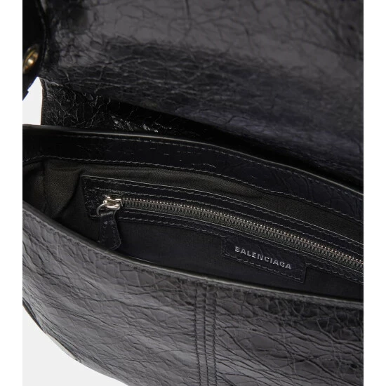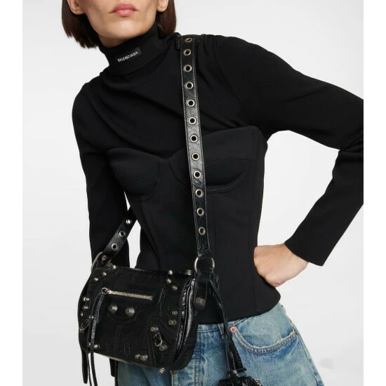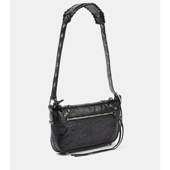 Balenciaga re-imagines a style from the ’00s with the Le Cagole XS shoulder bag. Made from black leather in a hemispherical shape, it suspends an outer zip pouch and AirPods case.
