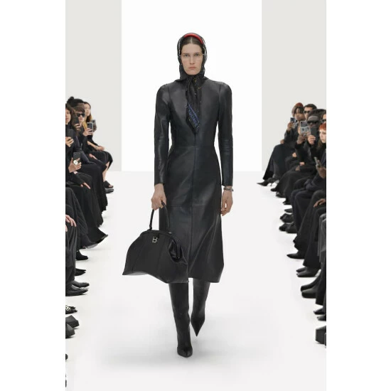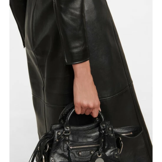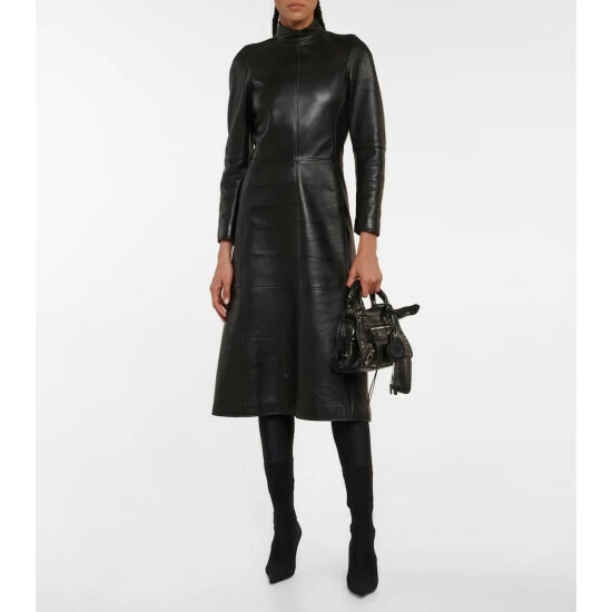 A winning style from Balenciaga’s Spring ’22 runway, this midi dress is made entirely from smooth, shiny lambskin leather. It has a high neck, a fitted shape, and zippers at the back and cuffs.