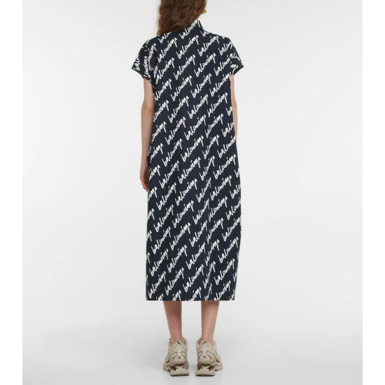 Balenciaga’s shirt dress features an all-over logo print in cursive writing. It’s cut from crisp cotton poplin to an oversized silhouette with cap sleeves and a midi-length hem.
