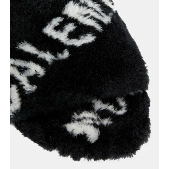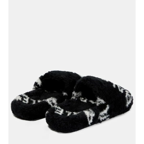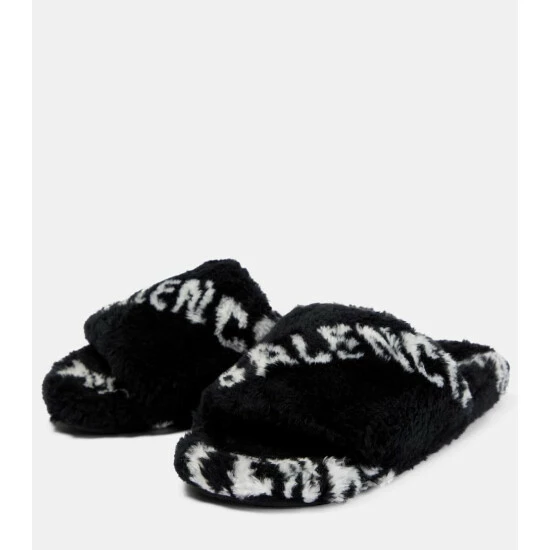 These Balenciaga sandals are made from soft faux fur with crossing straps and all-over logo lettering
