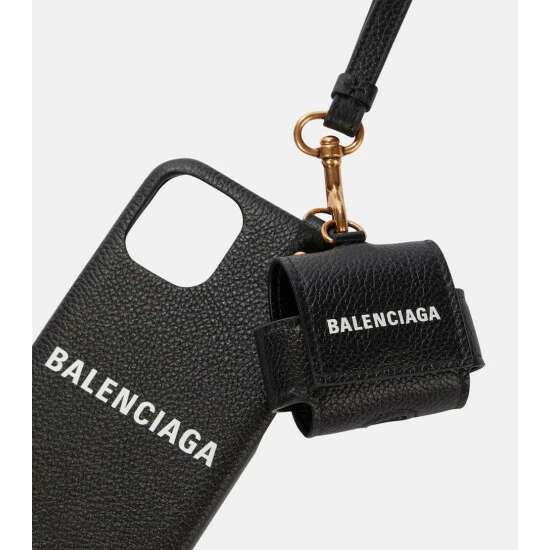 This Balenciaga phone cover is made from grained black leather and features a dangling cord attachment.