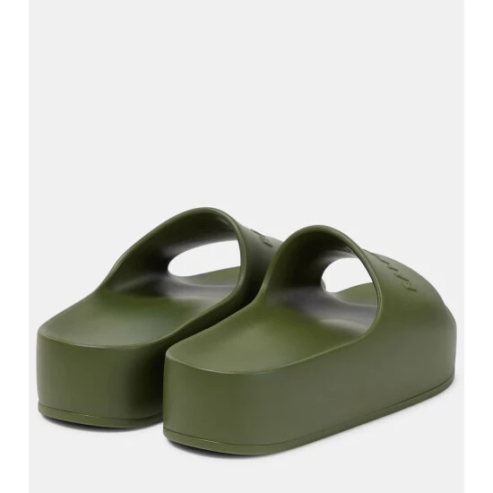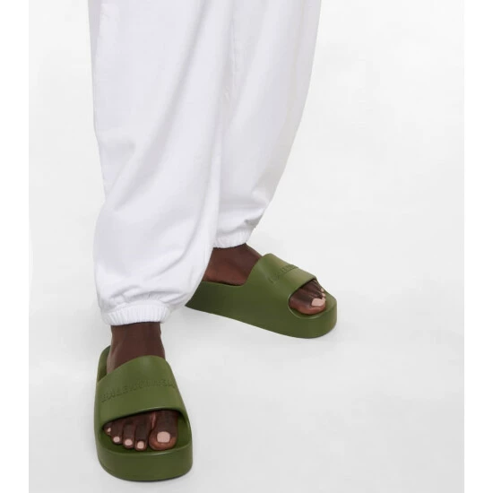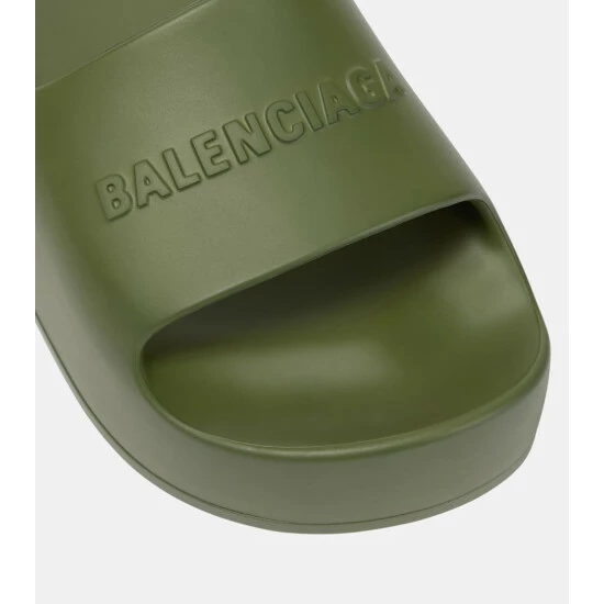 Slides like this olive green logo-embossed pair from Balenciaga are immeasurable in their versatility. They’re made from rubber with platform soles that are molded to encase the feet, as are the wide vamp straps.