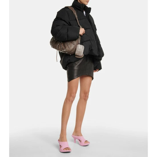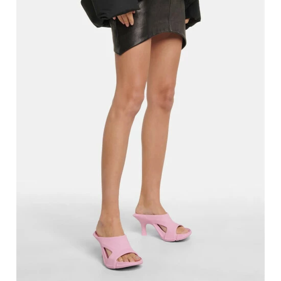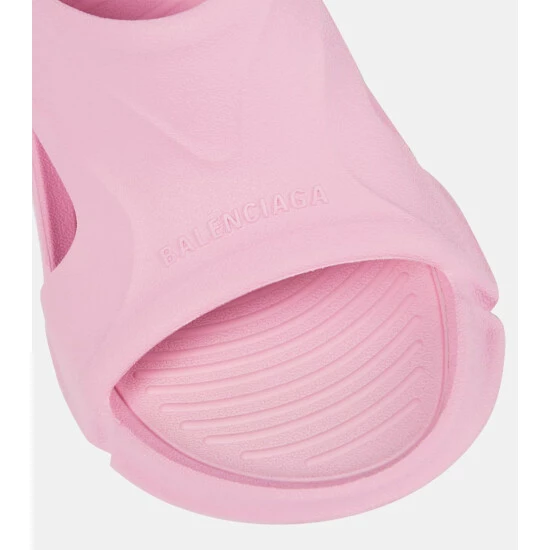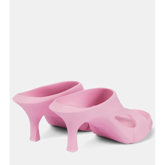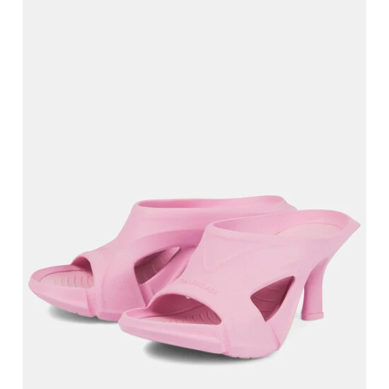 Balenciaga elevates its iconic Mold sandals into a futuristic heeled mule silhouette. This lightweight pair is sculpted from rubber in a cotton candy pink hue and features cutout detailing and peep-toes.
