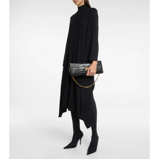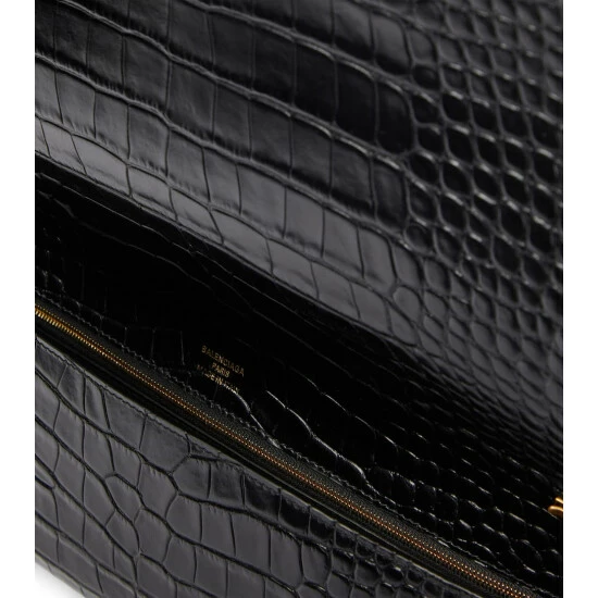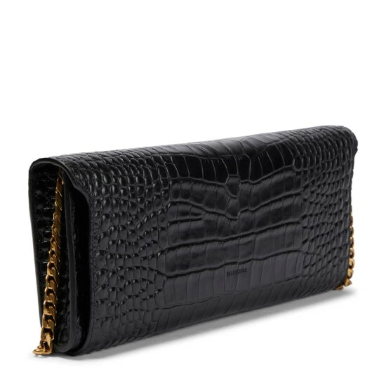 Balenciaga’s Money clutch has an elongated rectangular shape and a classic lock fastening. Made from croc-embossed calfskin leather, this black design comes with a detachable chainlink strap.