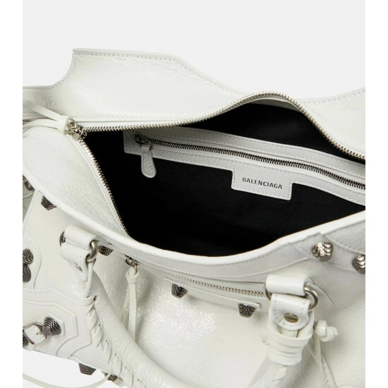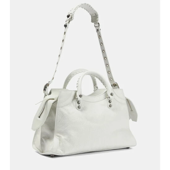 Balenciaga’s Neo Cagole City shoulder is made in Italy from white leather. Boasting a boxy silhouette with hand-braided handles and stylish hardware, the versatile design features multiple pockets, a detachable pouch and a heart-shaped mirror.