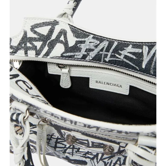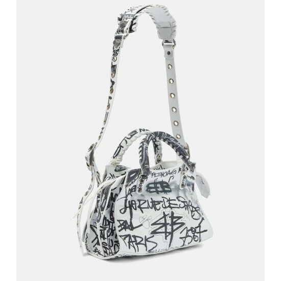 The Neo Cagole City XS tote bag from Balenciaga is made in Italy from Graffiti-printed leather to a boxy shape with hand-braided handles. The edgy textured hardware together with the numerous pockets, removable pouch, and heart-shaped mirror, will have you reach for this versatile staple again and again.