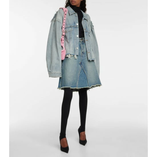 Instantly recognizable as Balenciaga, the off-shoulder Pants top is a standout style of the brand’s Winter ’22 collection. Made from medium-wash Japanese denim, the five-pocket rework achieves a modern edge with raw hems.