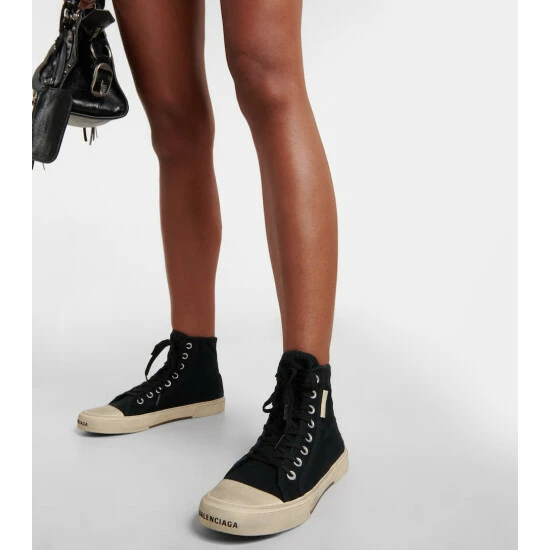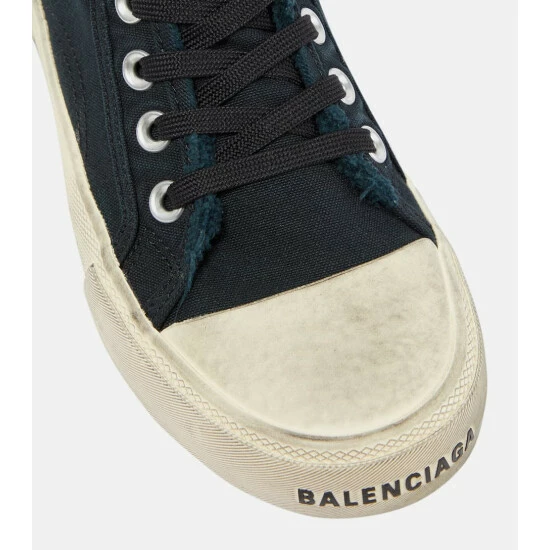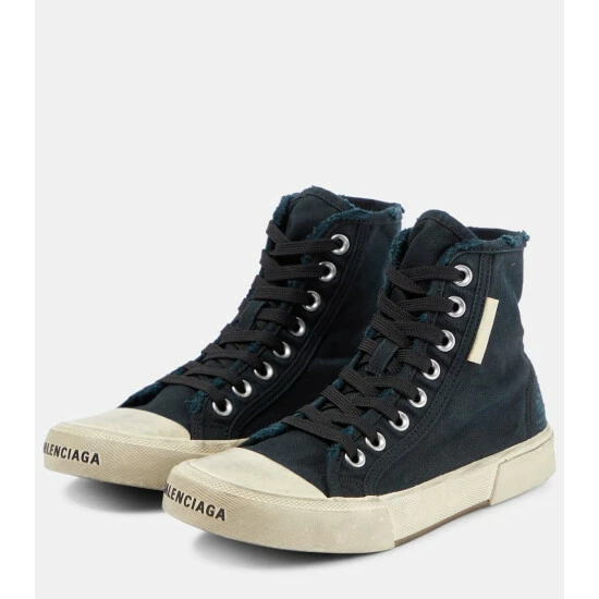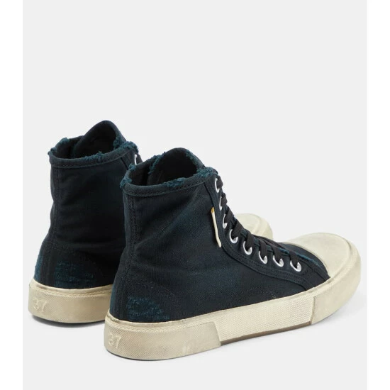 This take on Balenciaga’s Paris sneakers is made from dark blue cotton canvas and shaped into a raw-edged high-top silhouette. Scuffed rubber soles with logo lettering complete the look.