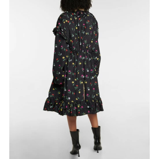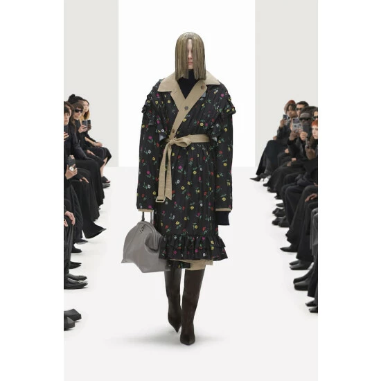 This trench coat from Balenciaga’s runway collection is a riff on the outerwear hero. It reverses from classic beige cotton twill to a floral-printed side that’s finished with ruffled trims and reminds of a dress.