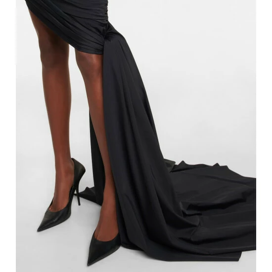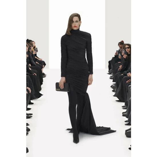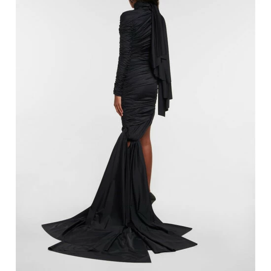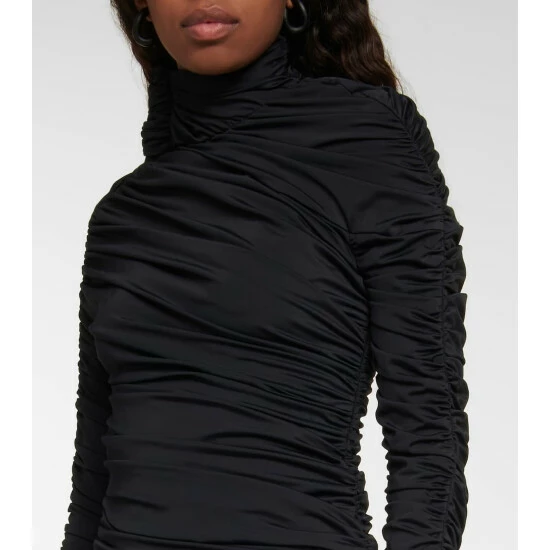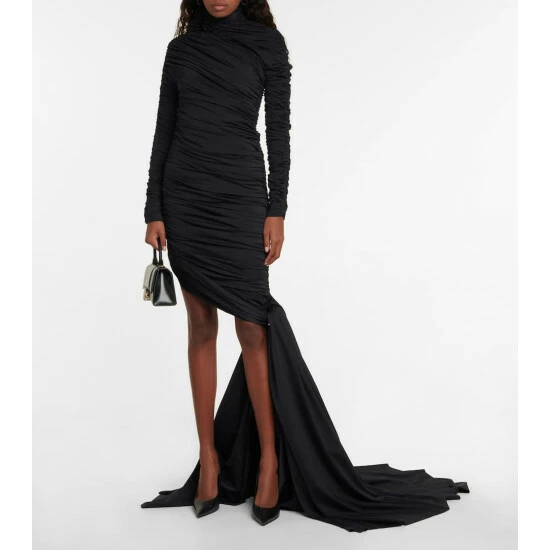 This ruched minidress from Balenciaga shows why we love the brand’s innovative approach to design. It’s tightly wrapped around the figure in a bodycon silhouette, and finished with knotted self-ties at the neckline and hem.