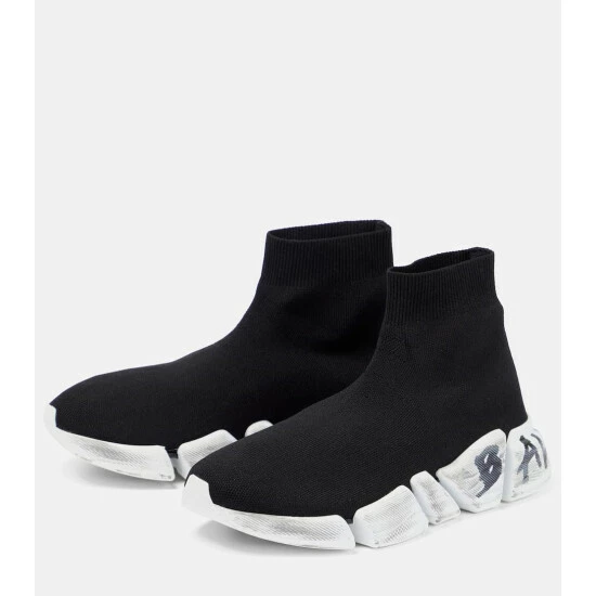 Balenciaga’s lightweight Speed 2.0 sneakers receive a seasonal makeover with love-worn logo graffiti soles. Delivering modern form to function, they feature sock-like knit uppers and textured rubber outsoles with memory sole and shock absorption technology.