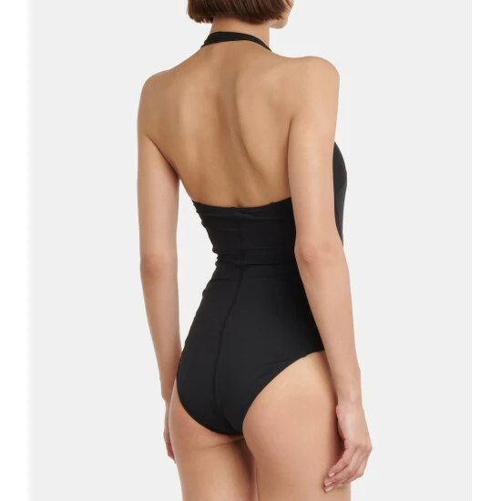 Clean and modern, this Balenciaga swimsuit is perfect for those who want to cut an athletic silhouette by the pool. Made from black swim jersey, this halterneck one-piece is printed with Sporty B logo insignia.