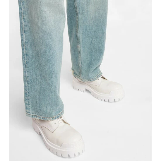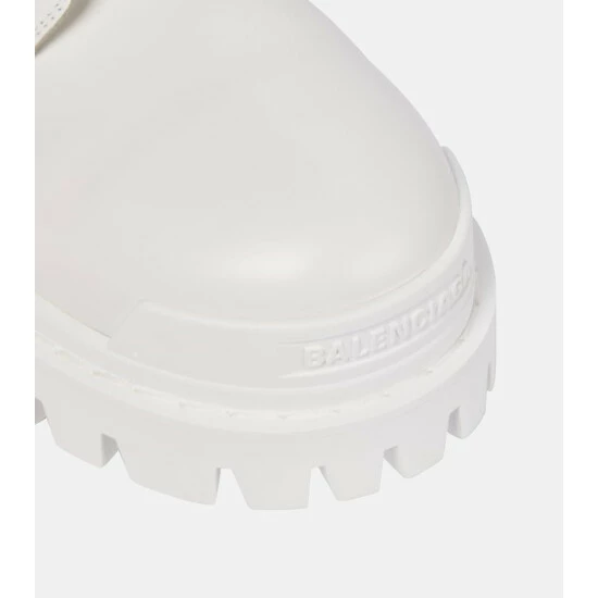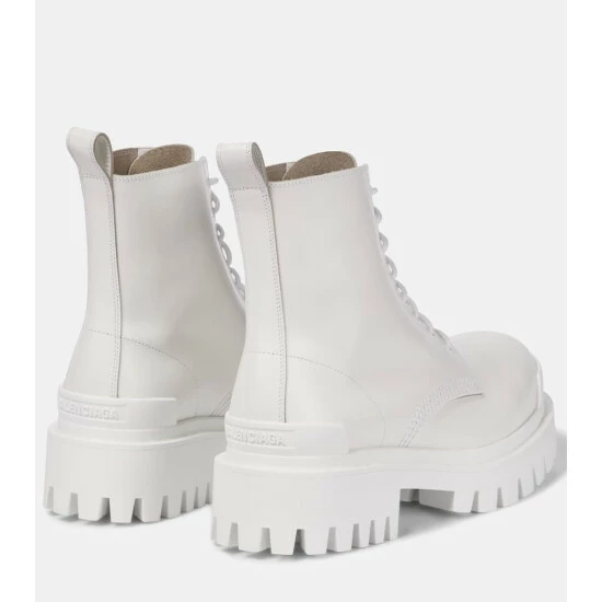 The white Strike combat boots showcase Balenciaga’s contemporary play on proportions. Made from leather and set on thick serrated soles, this lace-up design features branded toe caps.