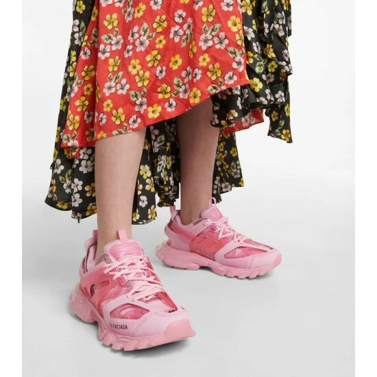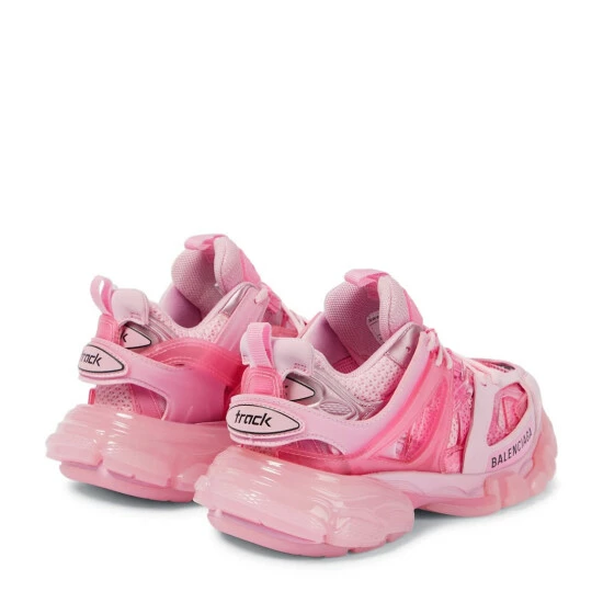 The Track Clear Sole sneakers from Balenciaga are inspired by an outdoor aesthetic and modelled after high-performance footwear styles. Made from pink mesh, nylon and PU uppers, they sit on clear chunky soles.